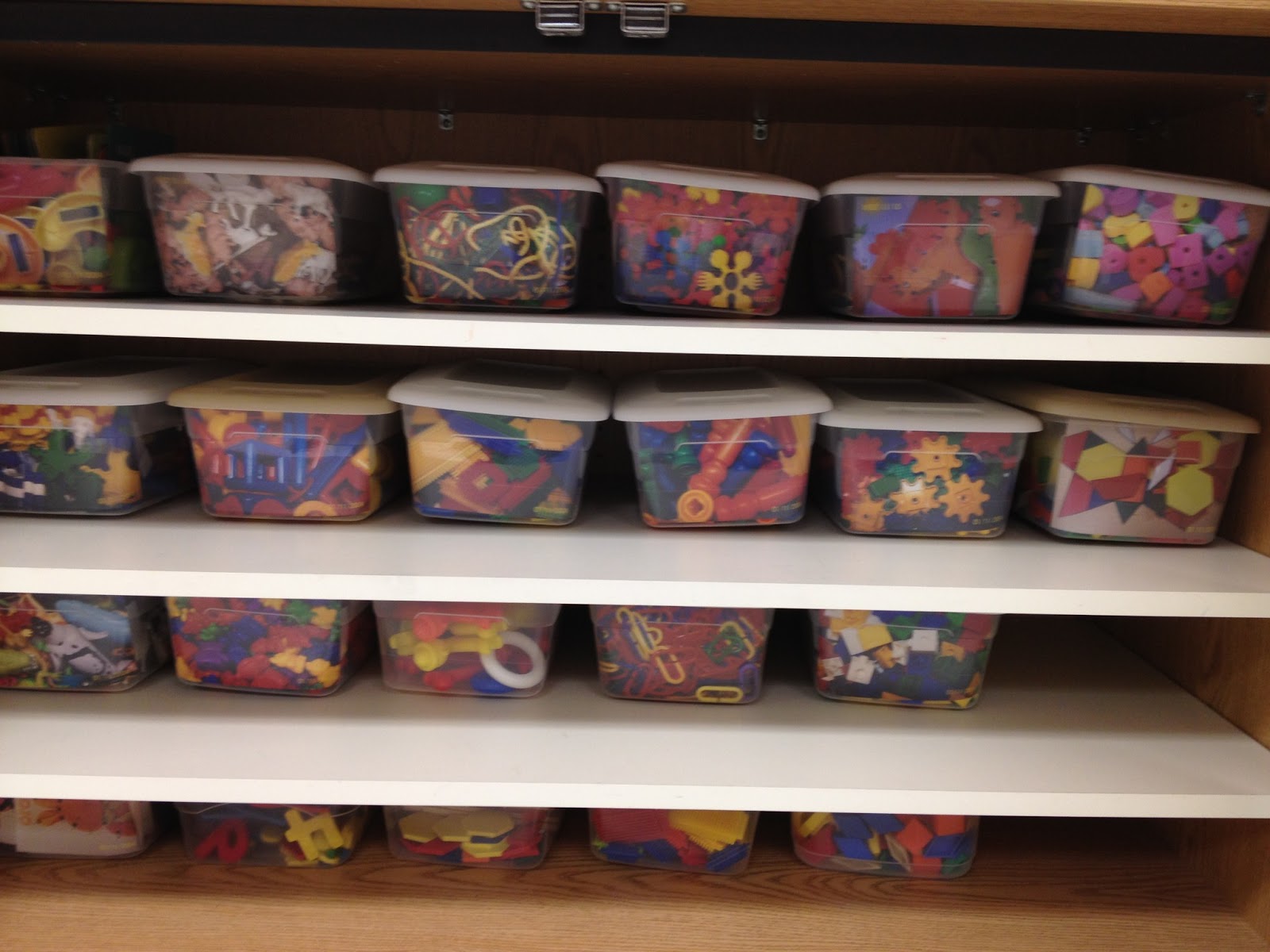 My last idea is one that has made things much easier for my little ones, thus helping keep me sane... it is simply putting a picture of the manipulative in the container and showing through the outside of the box. I do this for EVERYTHING in my room and it really helps things to get back into their proper places!
